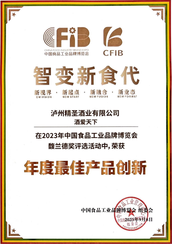瀘州精圣酒業(yè)有限公司出品的“精圣”牌酒愛天下·禮品酒,具有諸香渾然添陳、內斂渾厚飽滿、韻味甘綿雅凈,聞著香、喝著順、飲后心曠神怡的內在品質,以及銀裝素雅剔透、生態(tài)玉白韻綠的外在裝潢,在此次展會中以其“蓋世酒仙、內外兼修”的產品魅力優(yōu)勢脫穎而出,獲得馥蘭德獎2023年度產品創(chuàng)新獎。